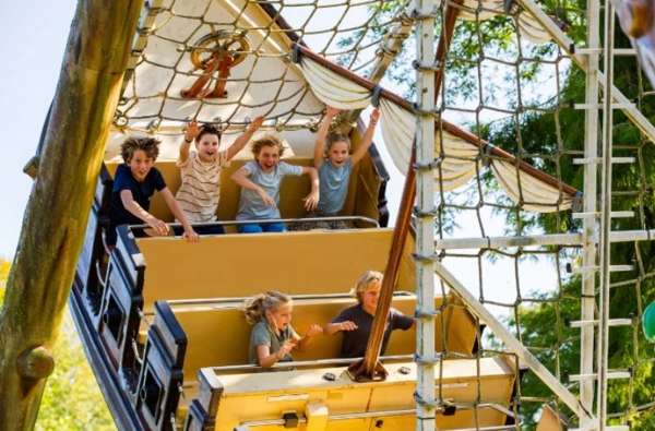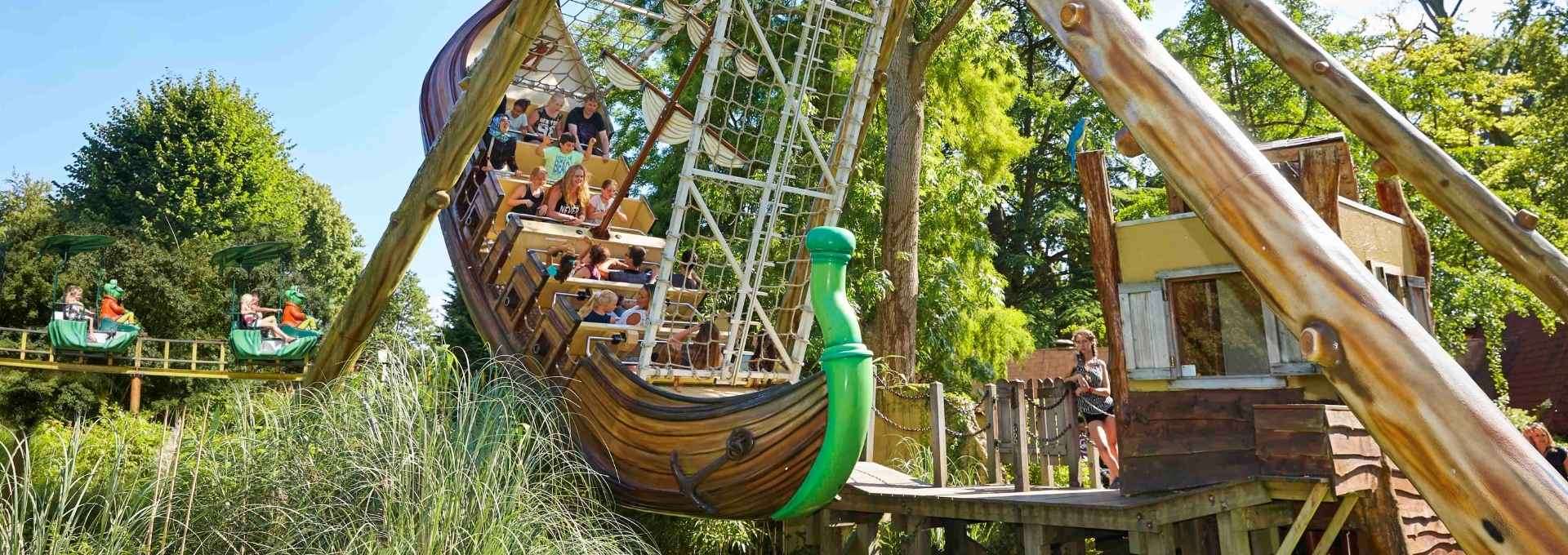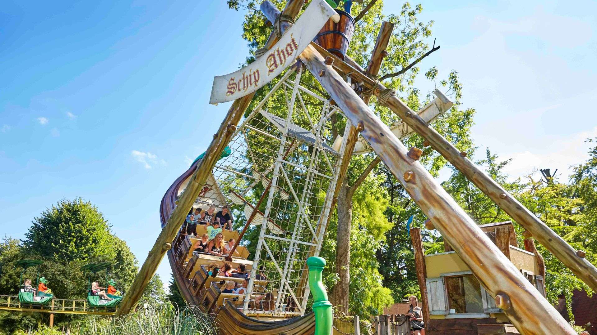 Schip Ahoi is een attractie op Rick's Avonturen Burcht. Er was eens een gewelddadige storm die het schip van Rick en zijn vrienden tegen de dikke muur van de burcht ramde. Schip Ahoi ligt hier nog steeds te schommelen. Vaar mee over de woeste zee, maar pas op ... dat gaat hard! Handen in de lucht en meevliegen is de enige optie tijdens deze storm! Durf jij aan boord te stappen?