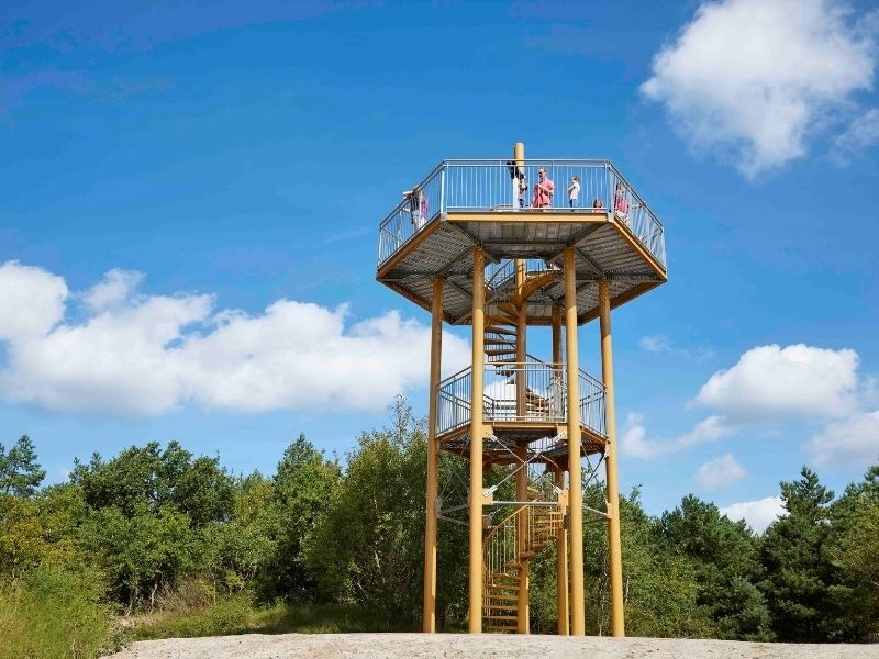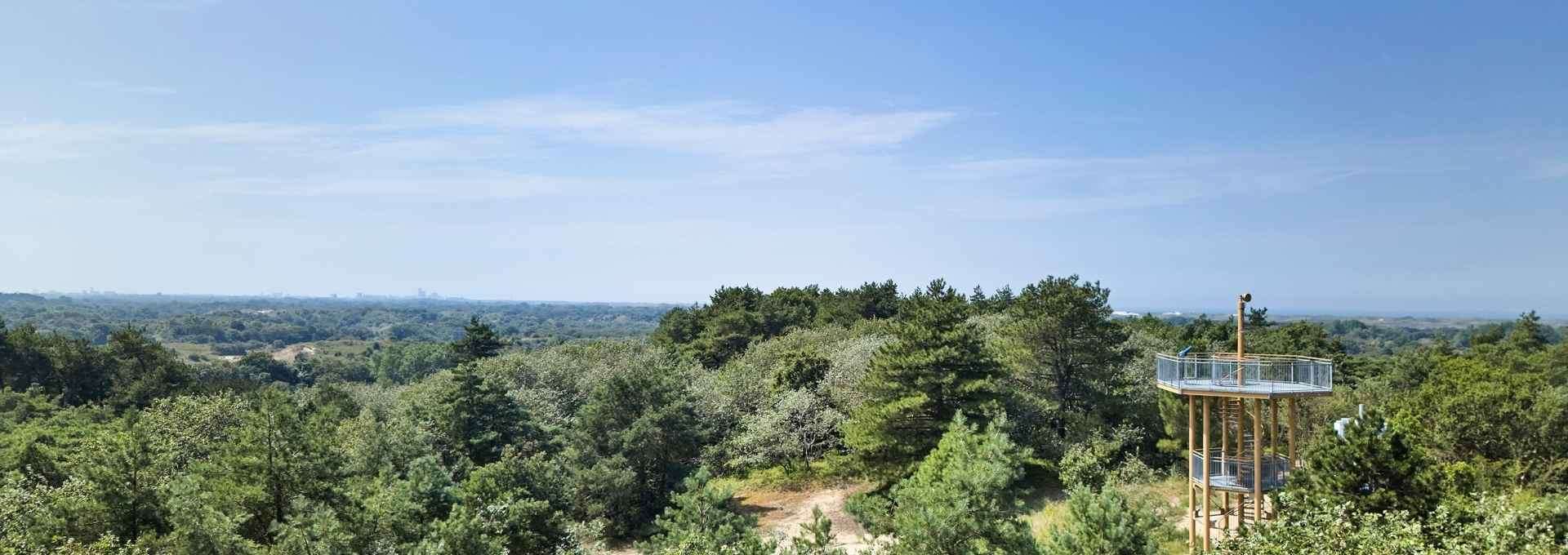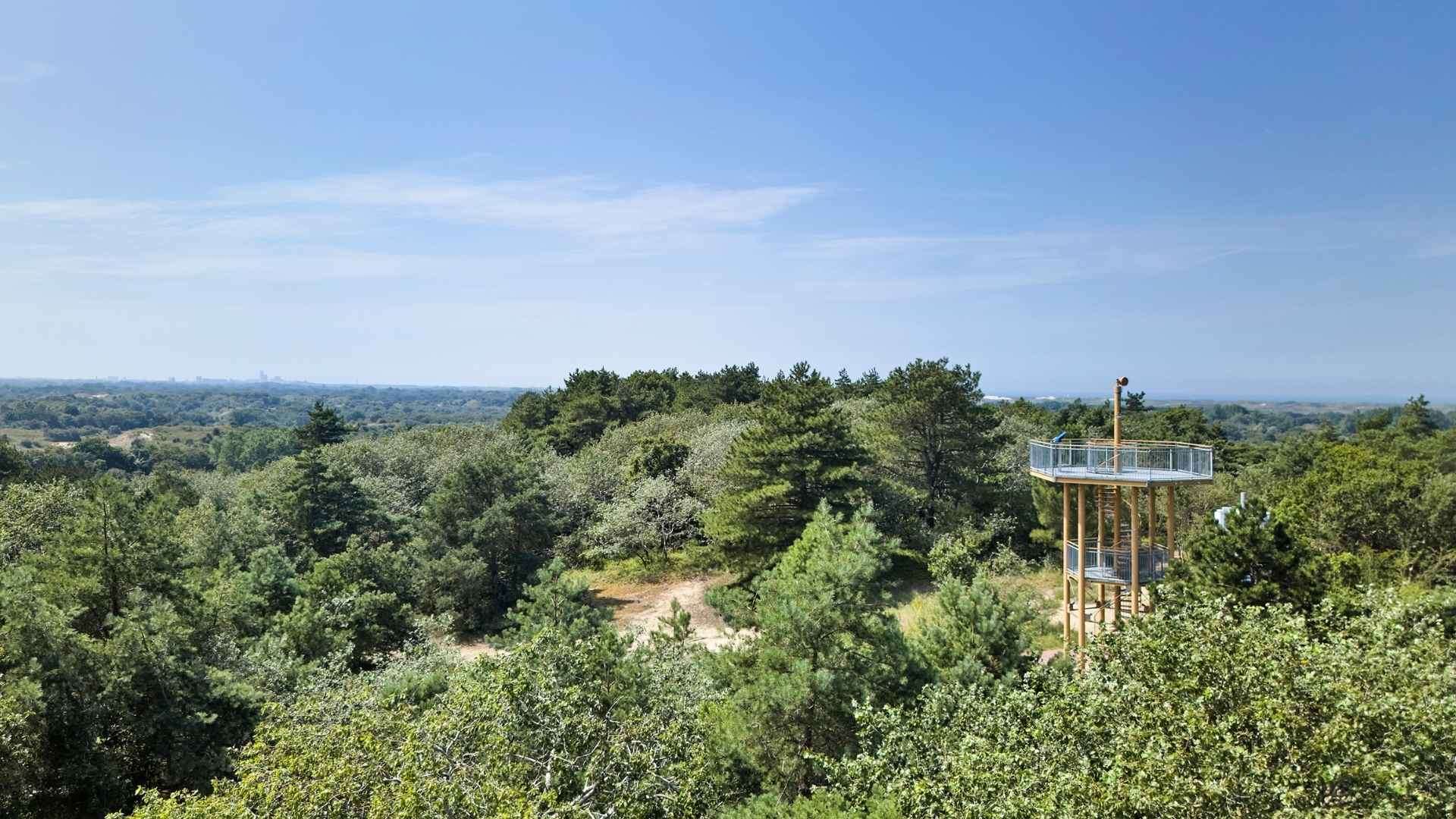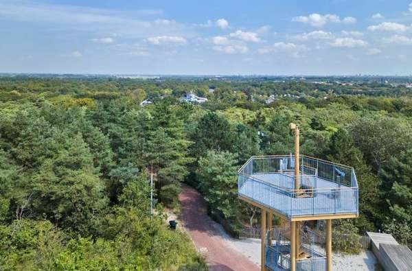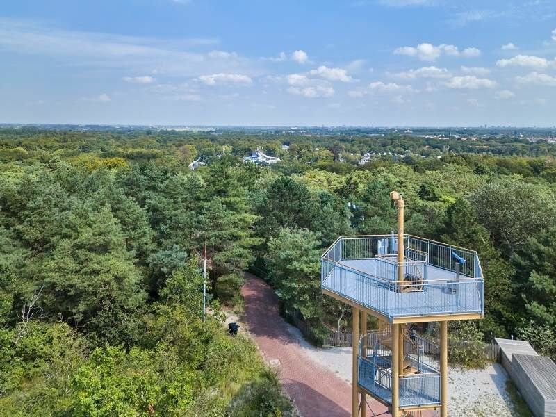 Om de uitkijktoren te bereiken moet je een aardige klim maken. De toren staat bovenop de heuvel waarvandaan de Rodelbaan naar beneden loopt. Dit is zelfs de hoogste duin van Zuid-Holland! Eenmaal boven word je beloond met een geweldig uitzicht. Je kijkt uit over het groen van Wassenaar en Duinrell: bomen, bomen en nog eens bomen. Maar je ziet ook het strand en de zee. Welke steden kun jij in de verte herkennen?