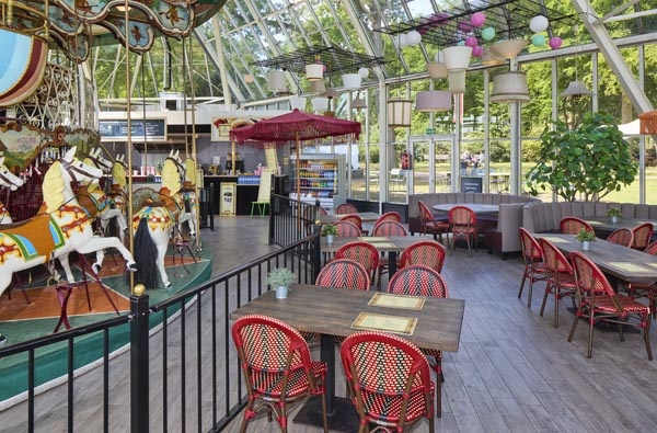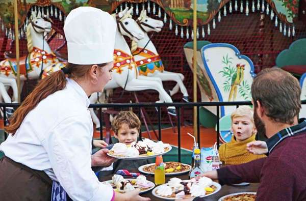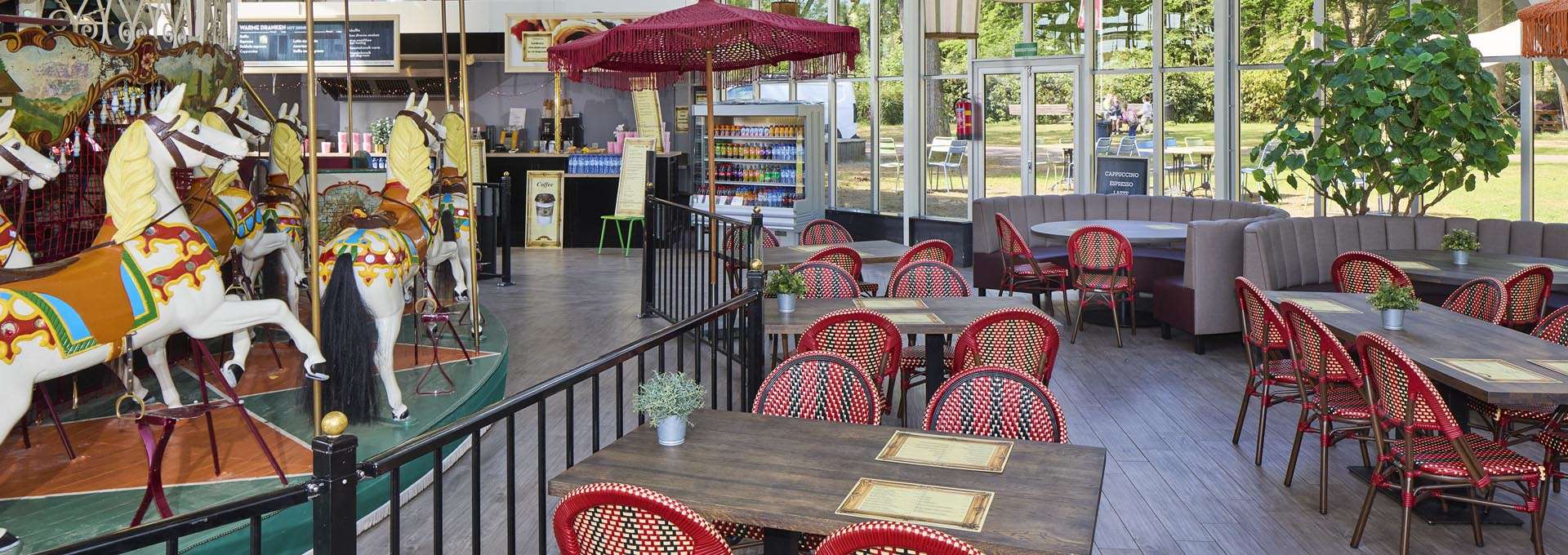 Midden in het restaurant vind je een ronddraaiend stukje geschiedenis: namelijk onze historische draaimolen uit 1864. Vroeger werd hij in beweging gezet door echte paarden. Gelukkig hebben we nu elektriciteit! Neem plaats op één van de paarden of stap samen in een wagentje.