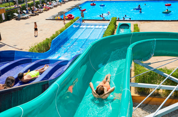 Zo is er de bekende Cycloon: een 15 meter hoge toren waar je razendsnel naar beneden glijdt en via een grote trechter in het water belandt. Doe je het liever rustig aan? Laat je dan in een band meevoeren over het water in de Lazy River. Voor kinderen onder de 120 cm is er een overdekt en verwarmd gedeelte waar zij veilig kunnen spetteren.