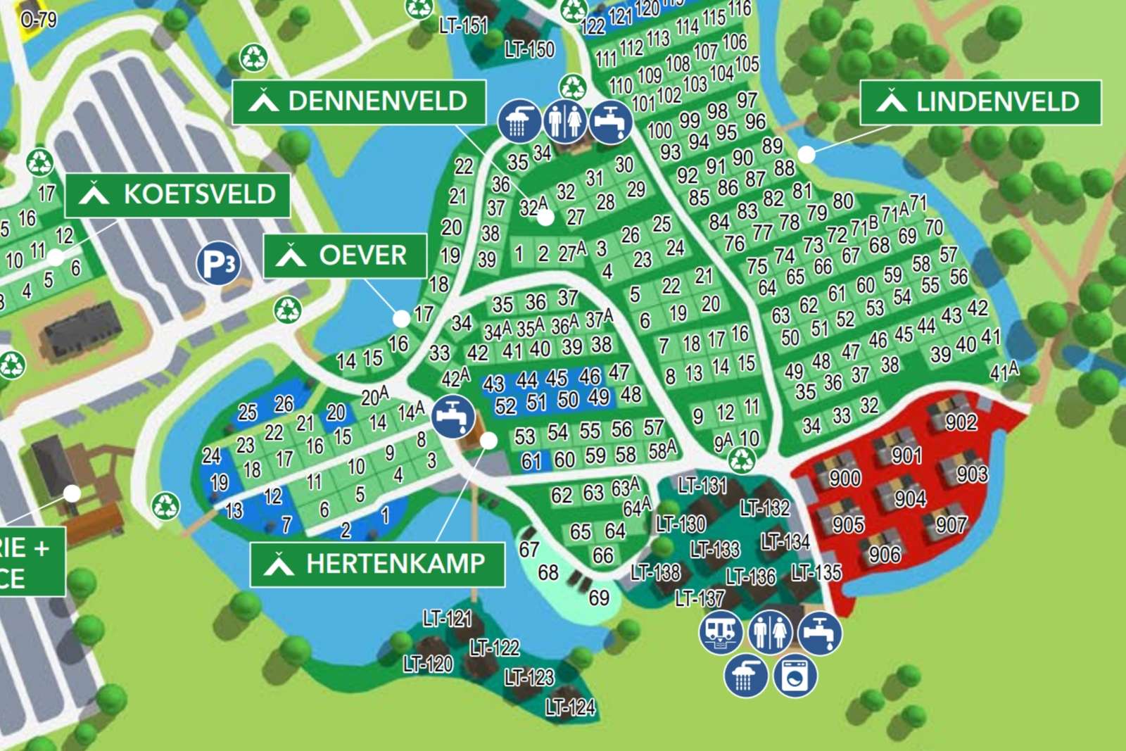 Deze kampeerplekken op het Hertenkamp hebben privé-sanitair op loopafstand (150 meter) van je kampeerplek. Het privé-sanitair heeft een eigen toilet, douche en wastafel. Het privé sanitair wordt op je aankomst dag tussen 12:00 en 15:00 uur schoongemaakt door Duinrell.
