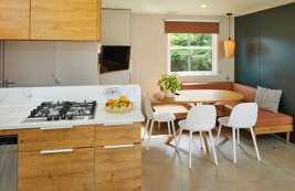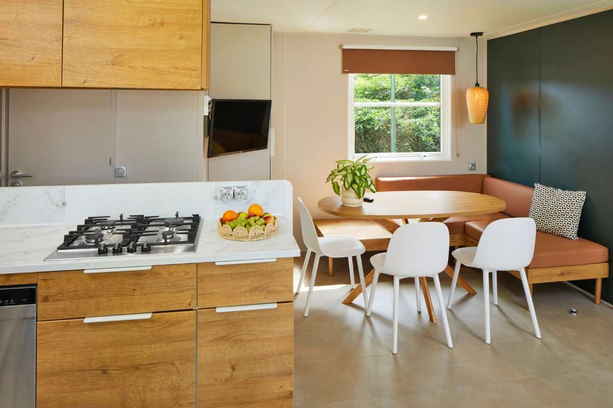 Zelf koken is in deze O’hara Duingalow een feestje. De ruime keuken is uitgerust met apparatuur en kookgerei en heeft een uitzicht naar buiten. De gezellige woonkeuken beschikt over een zitplek voor 2 personen en een gezellig ingerichte eethoek. De accommodatie heeft maar liefst twee badkamers met elk een douche en wastafel. Eén van de twee badkamers heeft ook een toilet. Daarnaast is er ook een apart toilet.
