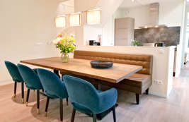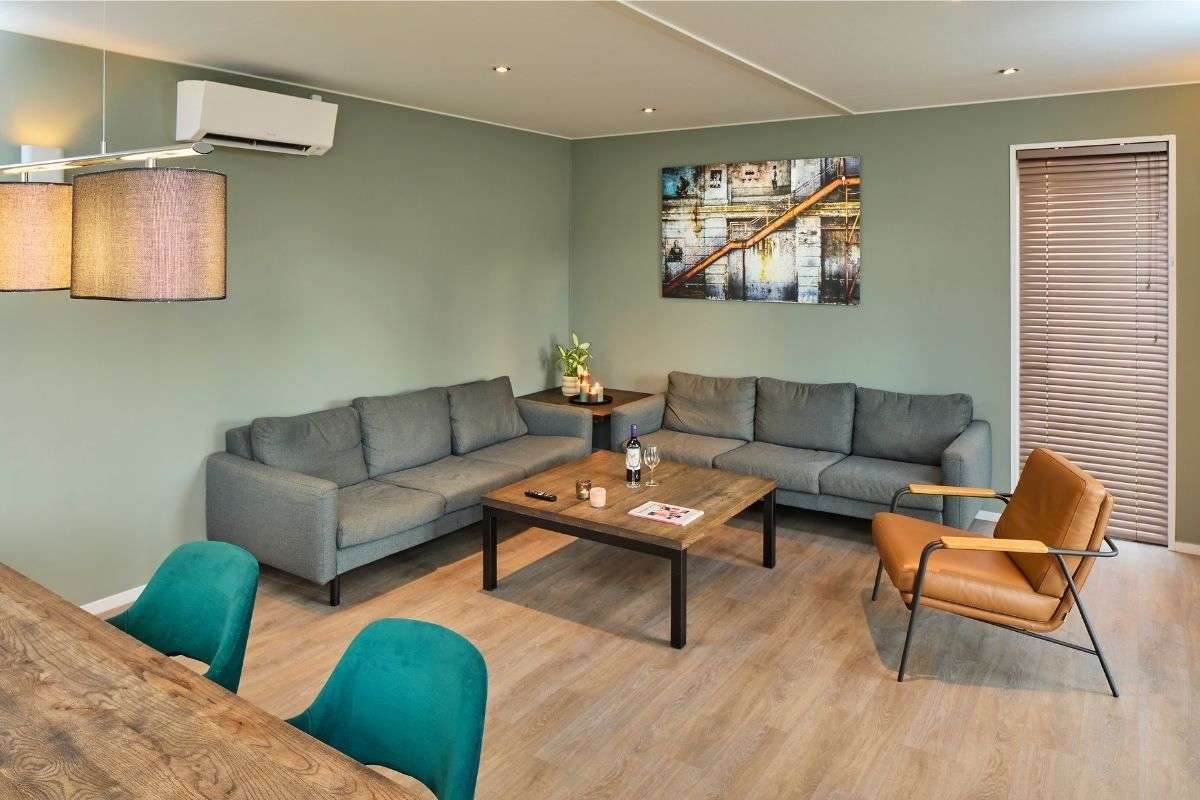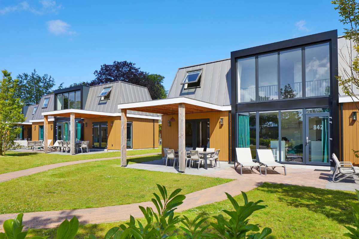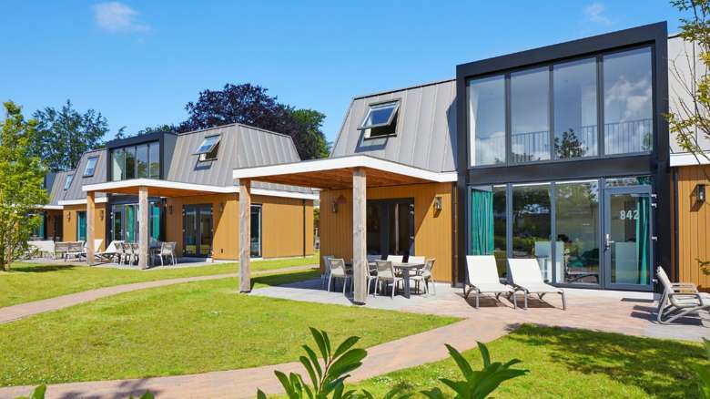 De 8-persoons Premium Plus Duingalow heeft veel grote ramen die zorgen voor veel lichtinval, waardoor je zelfs binnen het gevoel hebt dat je buiten bent. Is het buiten lekker weer? Dan betrek je heel gemakkelijk het buitenterras bij de woonkamer door de openslaande deuren. Schaduw vind je onder de overkapping met ruime zithoek. Ook handig als het regent.