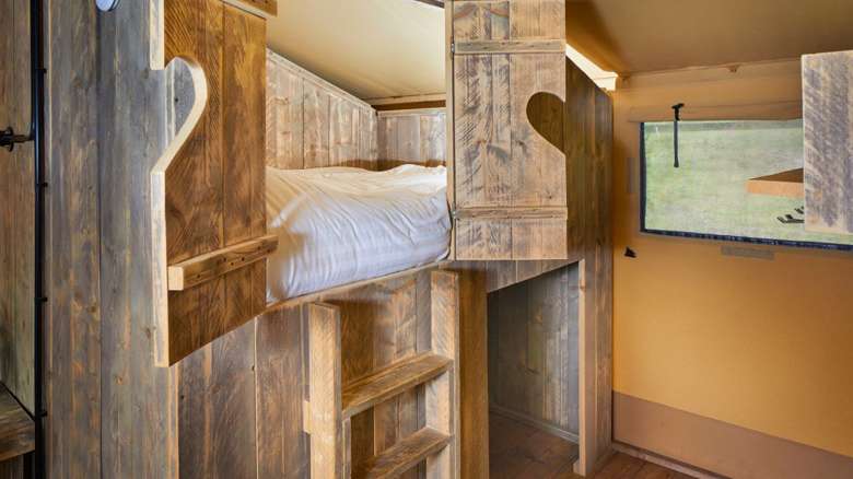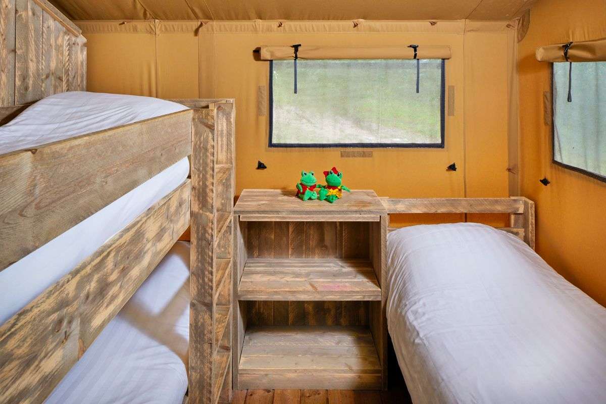 Let op: Luxe Lodgetent nr. 15 heeft geen bedstee, maar een losse tweepersoons lodgetent met twee bedden (4 + 2 personen totaal).