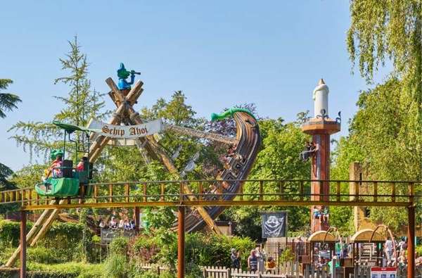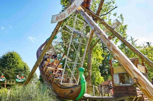 Schip Ahoi is een attractie op Rick's Avonturen Burcht. Er was eens een gewelddadige storm die het schip van Rick en zijn vrienden tegen de dikke muur van de burcht ramde. Schip Ahoi ligt hier nog steeds te schommelen. Vaar mee over de woeste zee, maar pas op ... dat gaat hard! Handen in de lucht en meevliegen is de enige optie tijdens deze storm! Durf jij aan boord te stappen?