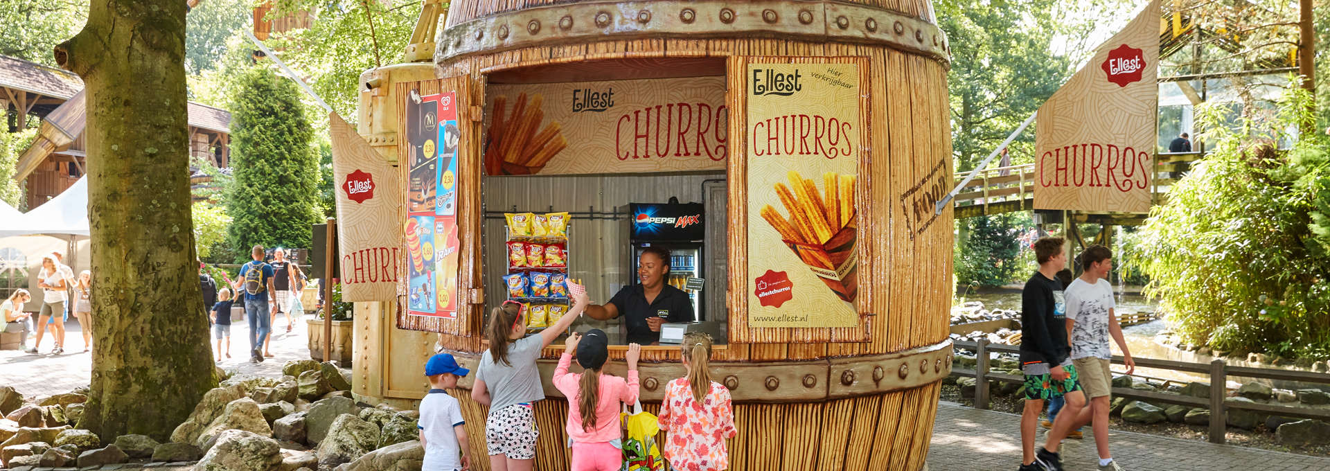Broodjes Unox, Churros, drankjes, ijsjes … Lekker snacken doe je bij één van de Smultonnen. Je vindt ze op diverse plekken in het attractiepark.