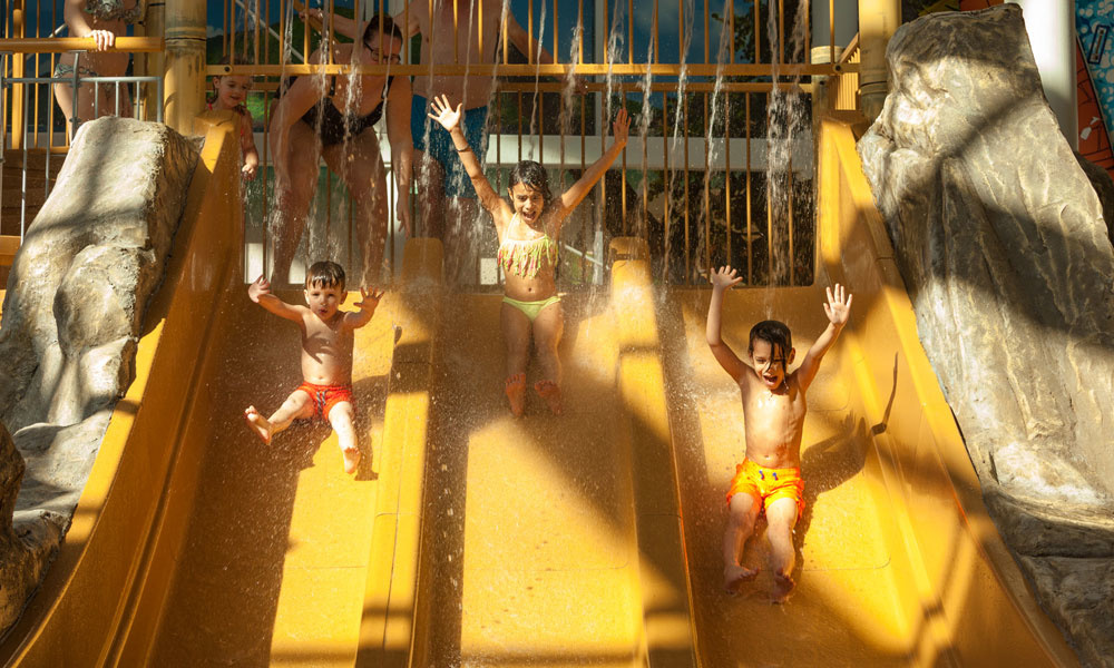 Superleuk en spannend: de tipping bucket. Er stroomt steeds een beetje water in, totdat-ie vol is. Dan valt hij om en … splash! Een waterval over je hoofd! Kids waterpark Playa is leuk voor kinderen tot de leeftijd van 12 jaar.
