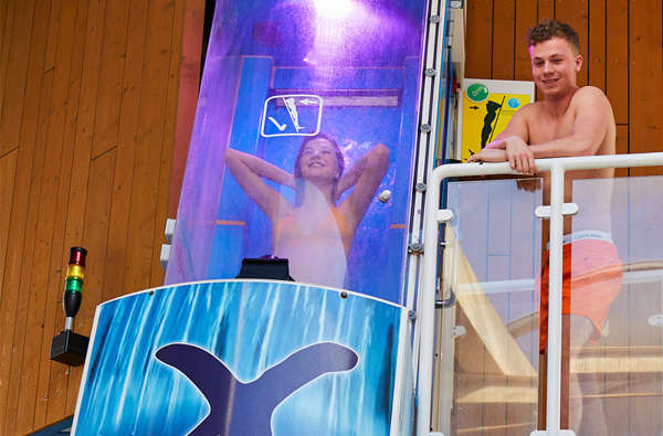 Op een hoogte van 7 meter draait een valluik onder de voeten van de waaghalzen weg en vallen zij met ca. 40 km/u naar beneden in een skim out.