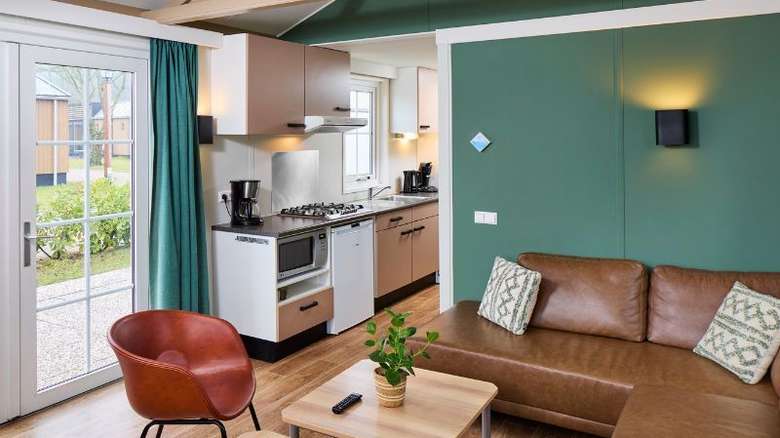 De keuken is compleet uitgerust om goed te kunnen koken: er is een vierpits gasfornuis en een combi-magnetron. Ook is er een vaatwasser en koffiezetapparaat aanwezig. In de badkamer bevindt zich een toilet.