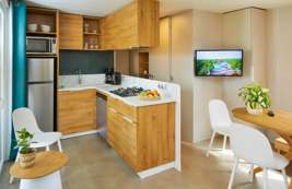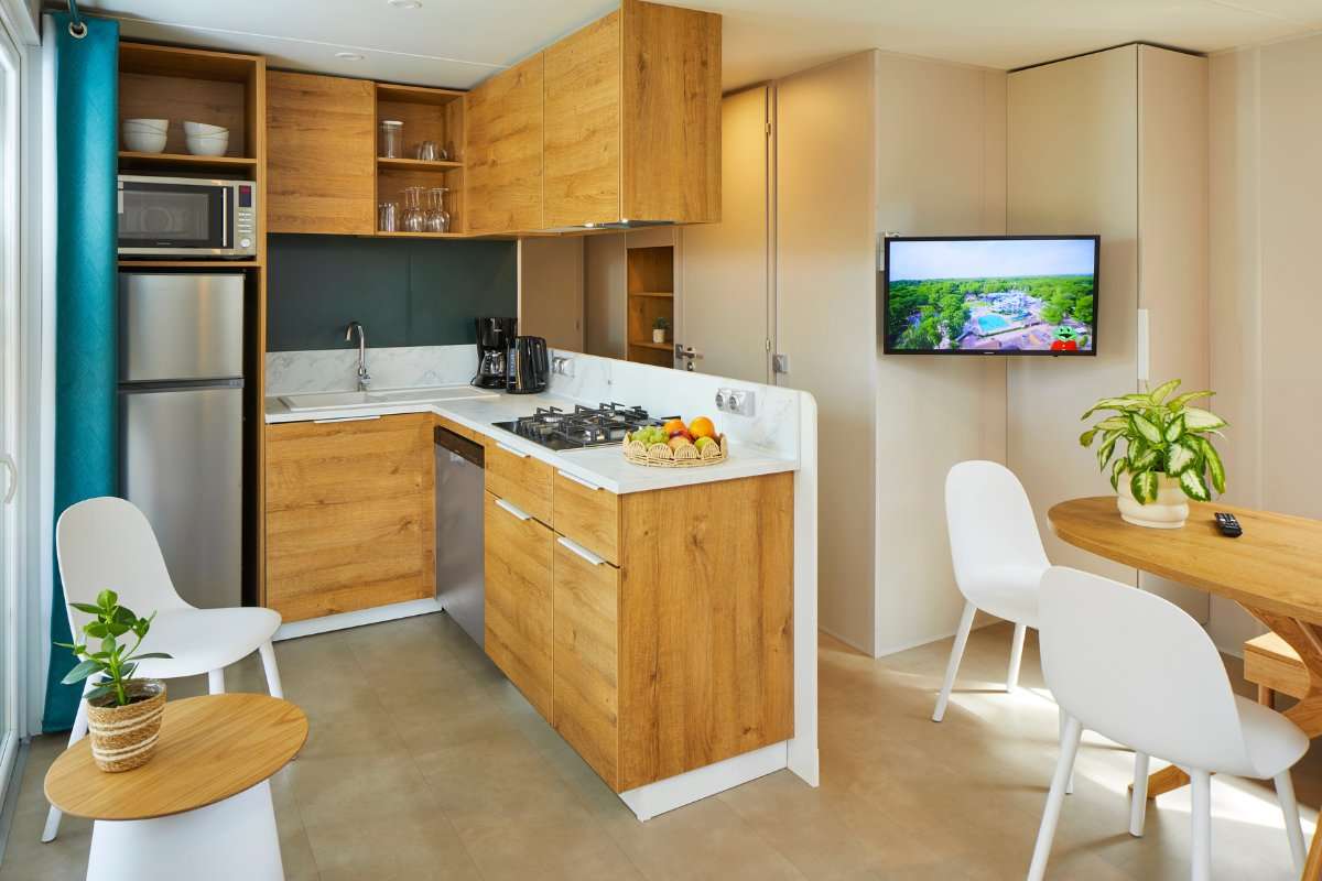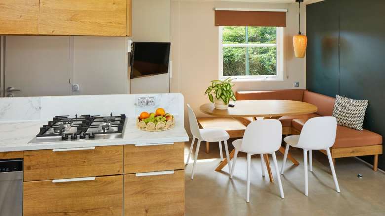 Zelf koken is in deze O’hara Duingalow een feestje. De ruime keuken is uitgerust met apparatuur en kookgerei en heeft een uitzicht naar buiten. De gezellige woonkeuken beschikt over een zitplek voor 2 personen en een gezellig ingerichte eethoek. De accommodatie heeft maar liefst twee badkamers met elk een douche en wastafel. Eén van de twee badkamers heeft ook een toilet. Daarnaast is er ook een apart toilet.