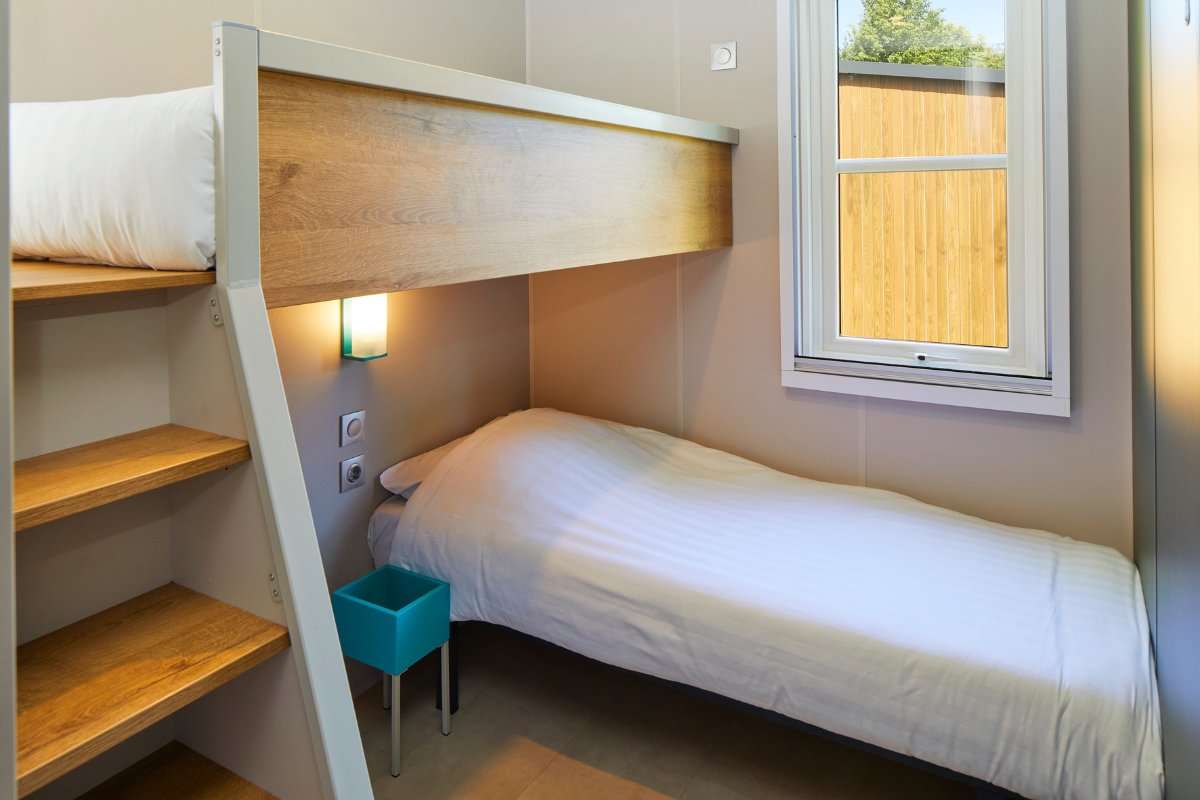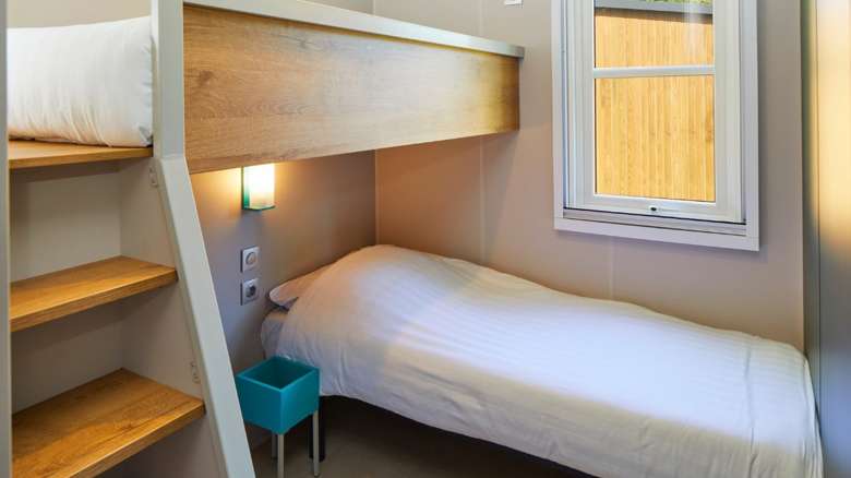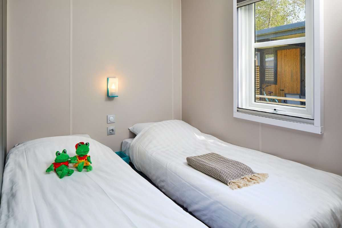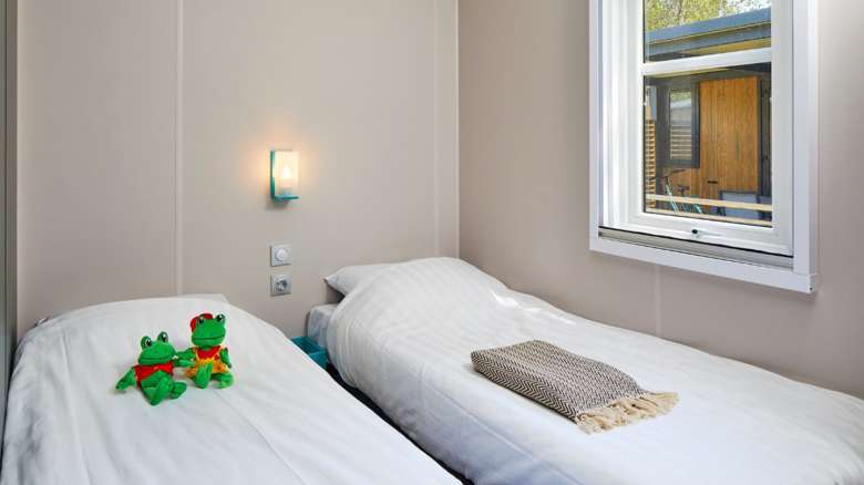 De Duingalow biedt plaats aan 6 personen en heeft drie slaapkamers: een slaapkamer met een tweepersoonsbed, een slaapkamer met twee losse eenpersoonsbedden en een kinderslaapkamer met een hoogslaper en een los eenpersoonsbed.