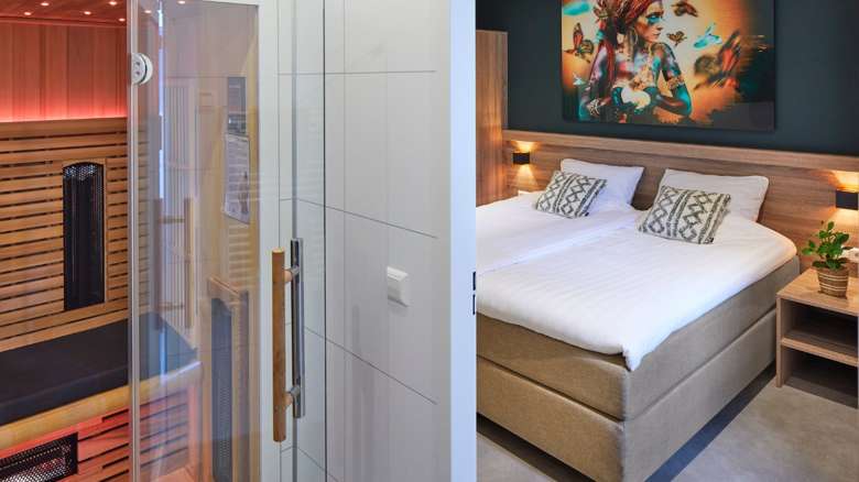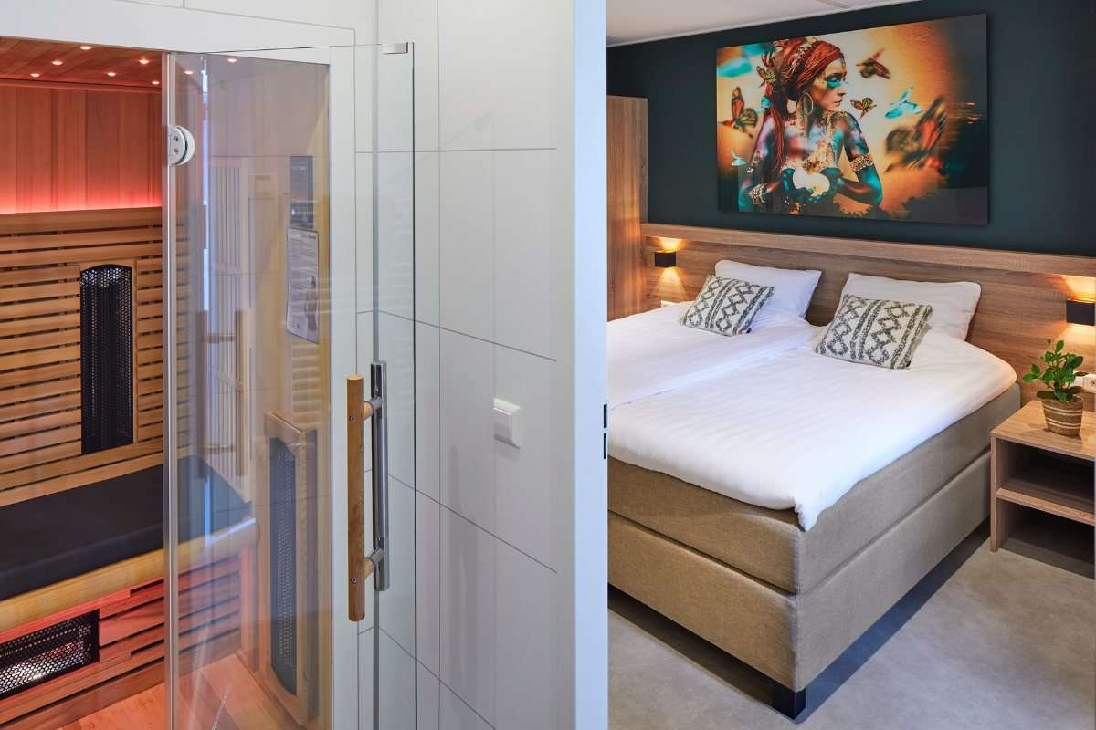 In deze Wellness Duingalow bevindt zich 1 slaapkamer met een groot tweepersoons boxspringbed. Ook beschikt deze vakantiewoning over een luxe badkamer met een Infra Rood-sauna en een dubbele inloopdouche. Tot slot is er een apart toilet beschikbaar.