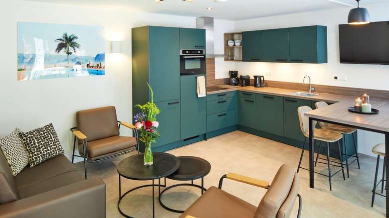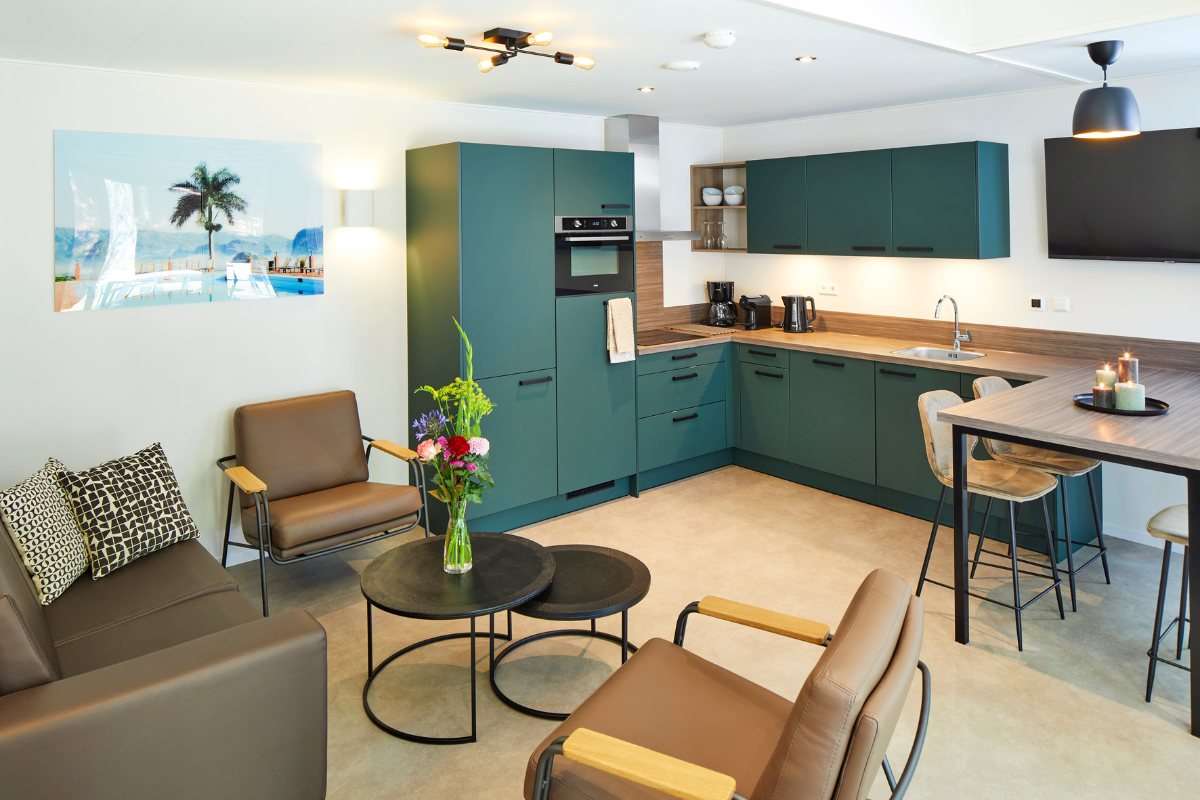 De woonkamer bestaat uit een gezellige woonkeuken met een relaxte zithoek en eetgedeelte, waar gezellig samen kan worden gegeten. De keuken is voorzien van een afwasmachine, Nespresso koffiezetapparaat en koelkast met vriesvak.