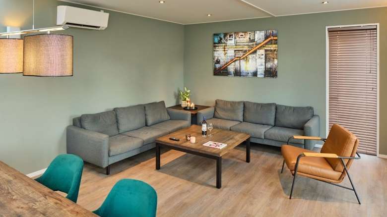 De 8-persoons Premium Plus Duingalow heeft veel grote ramen die zorgen voor veel lichtinval, waardoor je zelfs binnen het gevoel hebt dat je buiten bent. Is het buiten lekker weer? Dan betrek je heel gemakkelijk het buitenterras bij de woonkamer door de openslaande deuren. Schaduw vind je onder de overkapping met ruime zithoek. Ook handig als het regent.