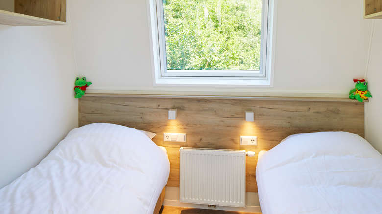 Op de eerste verdieping bevinden zich drie slaapkamers. Twee slaapkamers met een tweepersoons boxspringbed en een slaapkamer met twee losse boxspringbedden. Ook vind je er een apart toilet en een ruime badkamer met inloopdouche en twee wastafels.