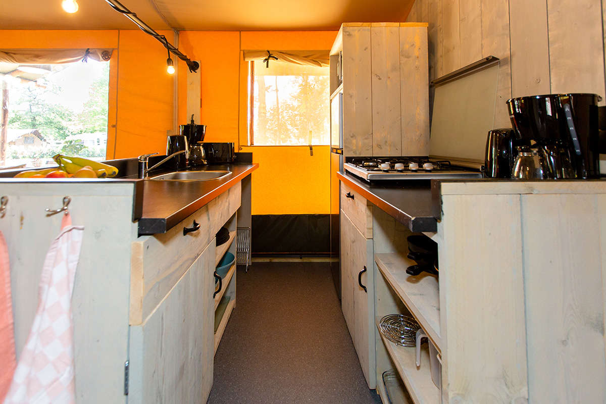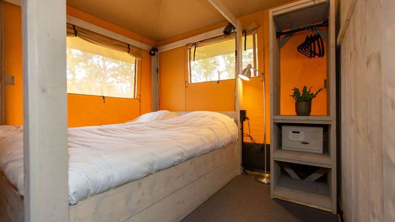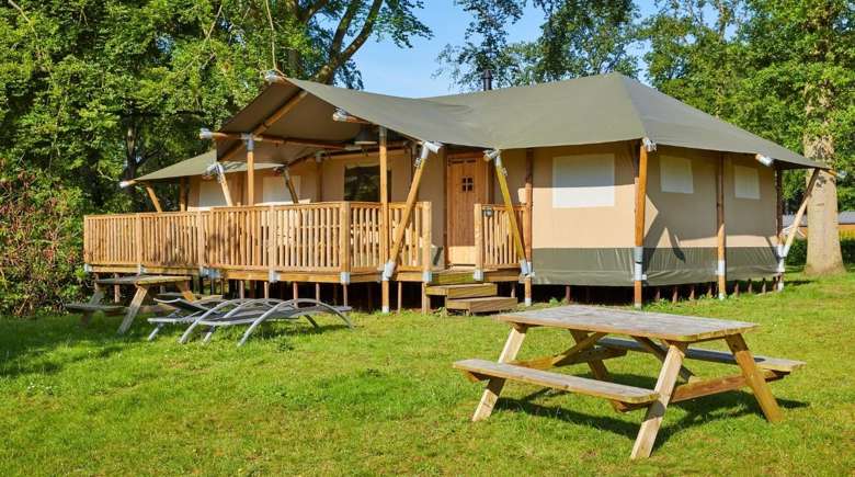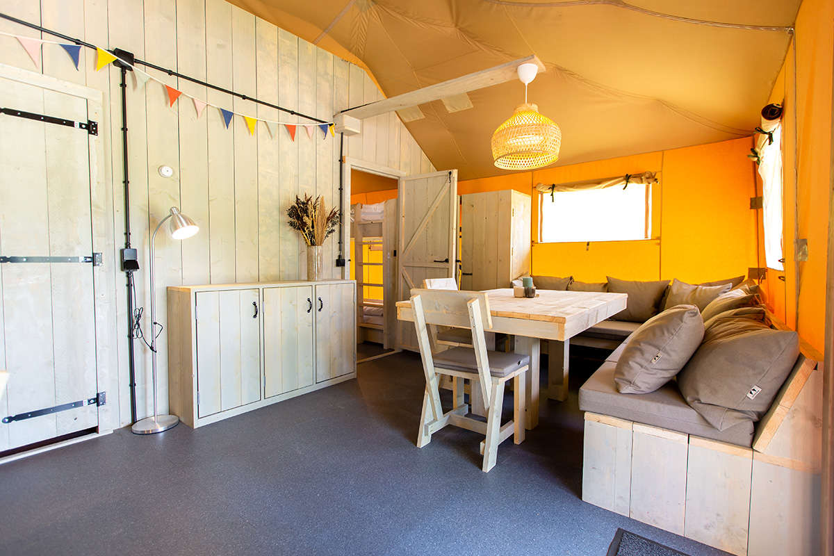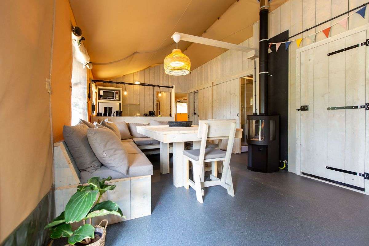 Met een totale vloeroppervlakte van 76,5 m² voelt de tent heerlijk ruim aan. En door de ruime veranda met luifel en grote picknicktafel geniet je samen van het ultieme buitenleven.