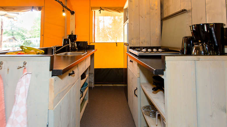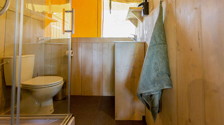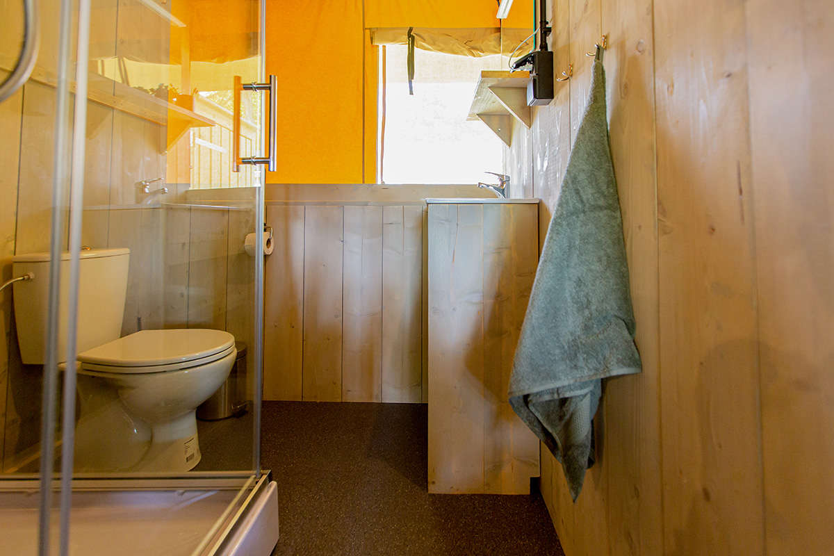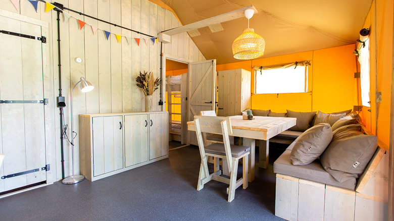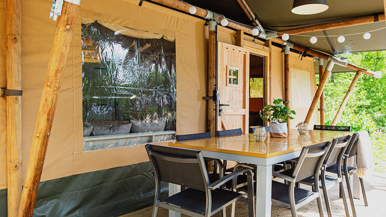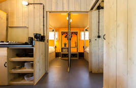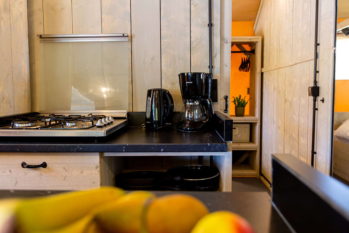 Met een totale vloeroppervlakte van 76,5 m² voelt de tent heerlijk ruim aan. En door de ruime veranda met luifel en grote picknicktafel geniet je samen van het ultieme buitenleven.