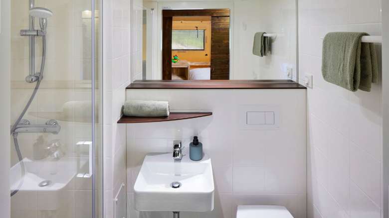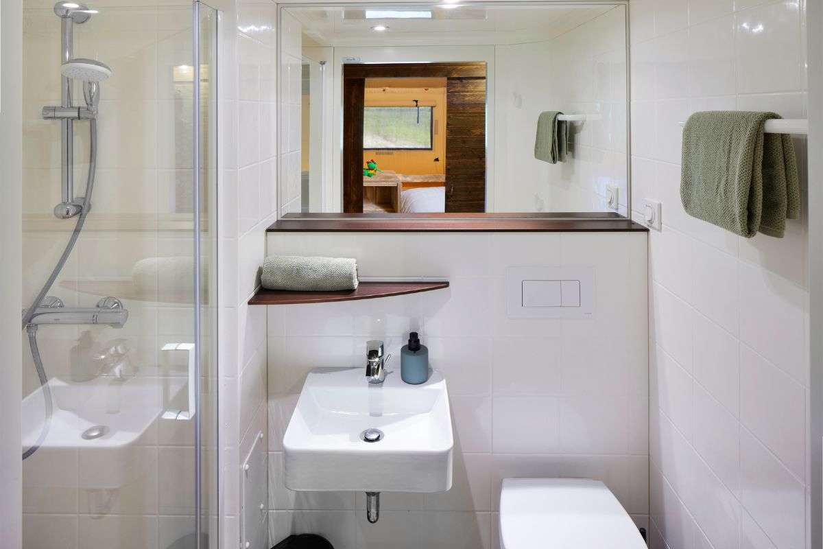 De Luxe Lodgetent is ook voorzien van een eigen badkamer met douche, wastafel en toilet. Tandenpoetsen, naar de wc gaan én douchen doe je dus gewoon in je eigen tent.