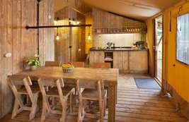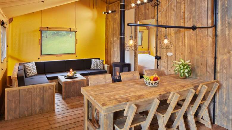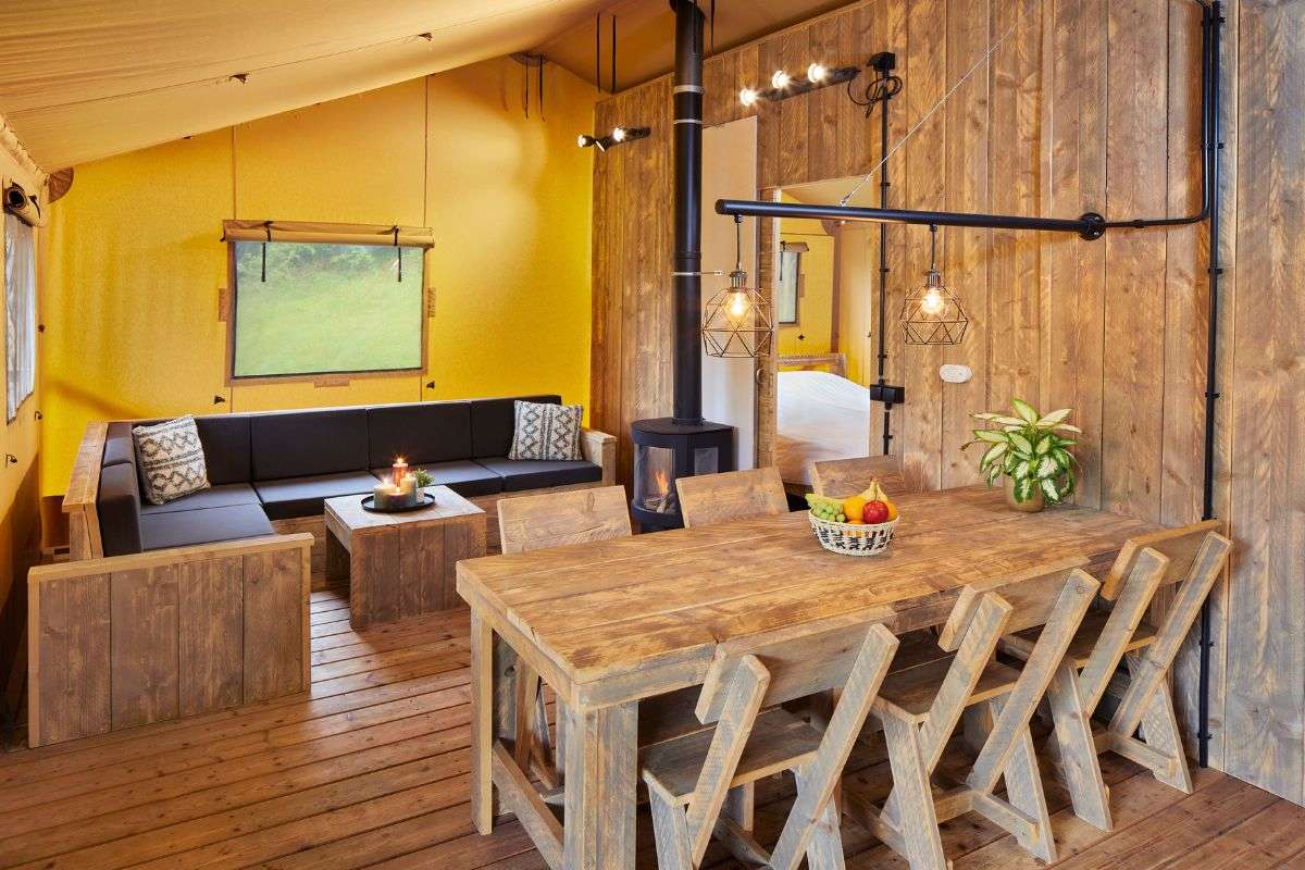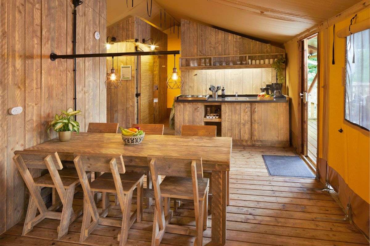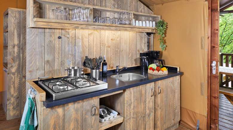 De indeling van de Luxe Lodgetent voor 6 personen bestaat uit een keuken met onder andere een gasfornuis, koelkast en combi-magnetron. De zit- en eethoek is gemaakt van steigerhouten meubels en zorgt ervoor dat je comfortabel kunt zitten.