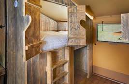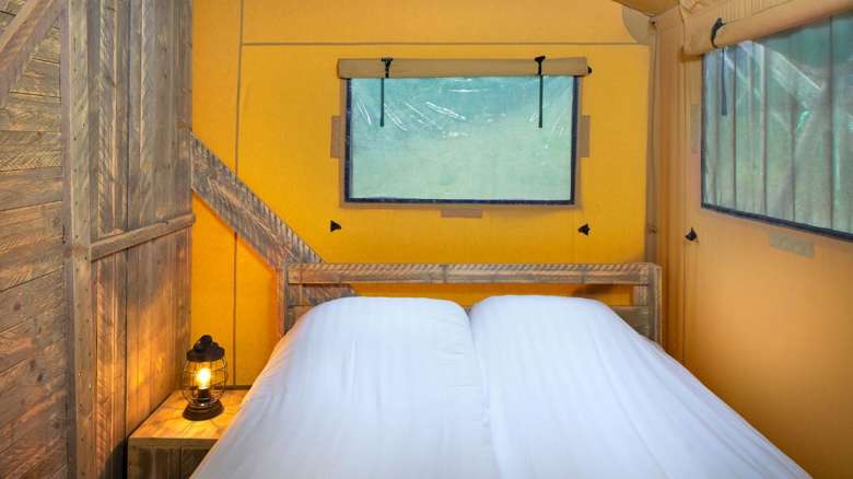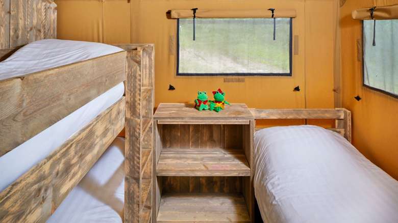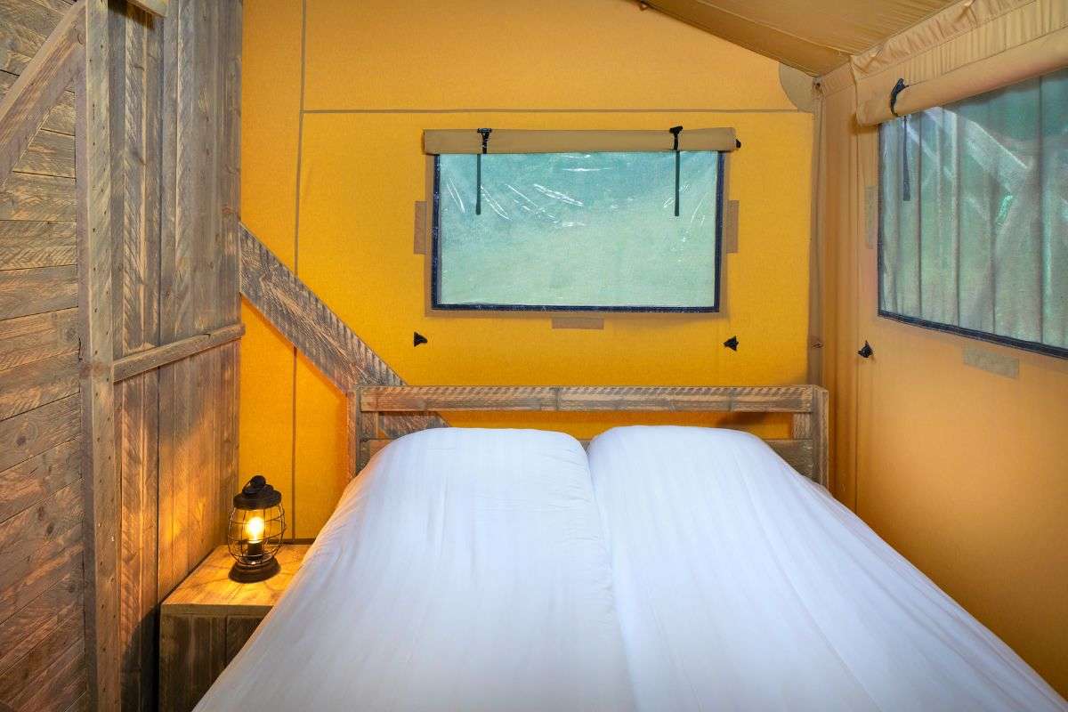 Let op: Luxe Lodgetent nr. 15 heeft geen bedstee, maar een losse tweepersoons lodgetent met twee bedden (4 + 2 personen totaal).