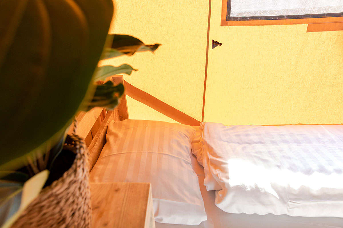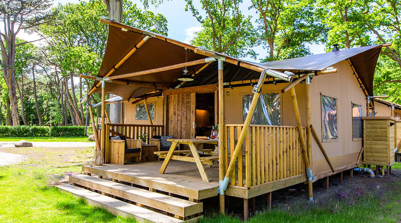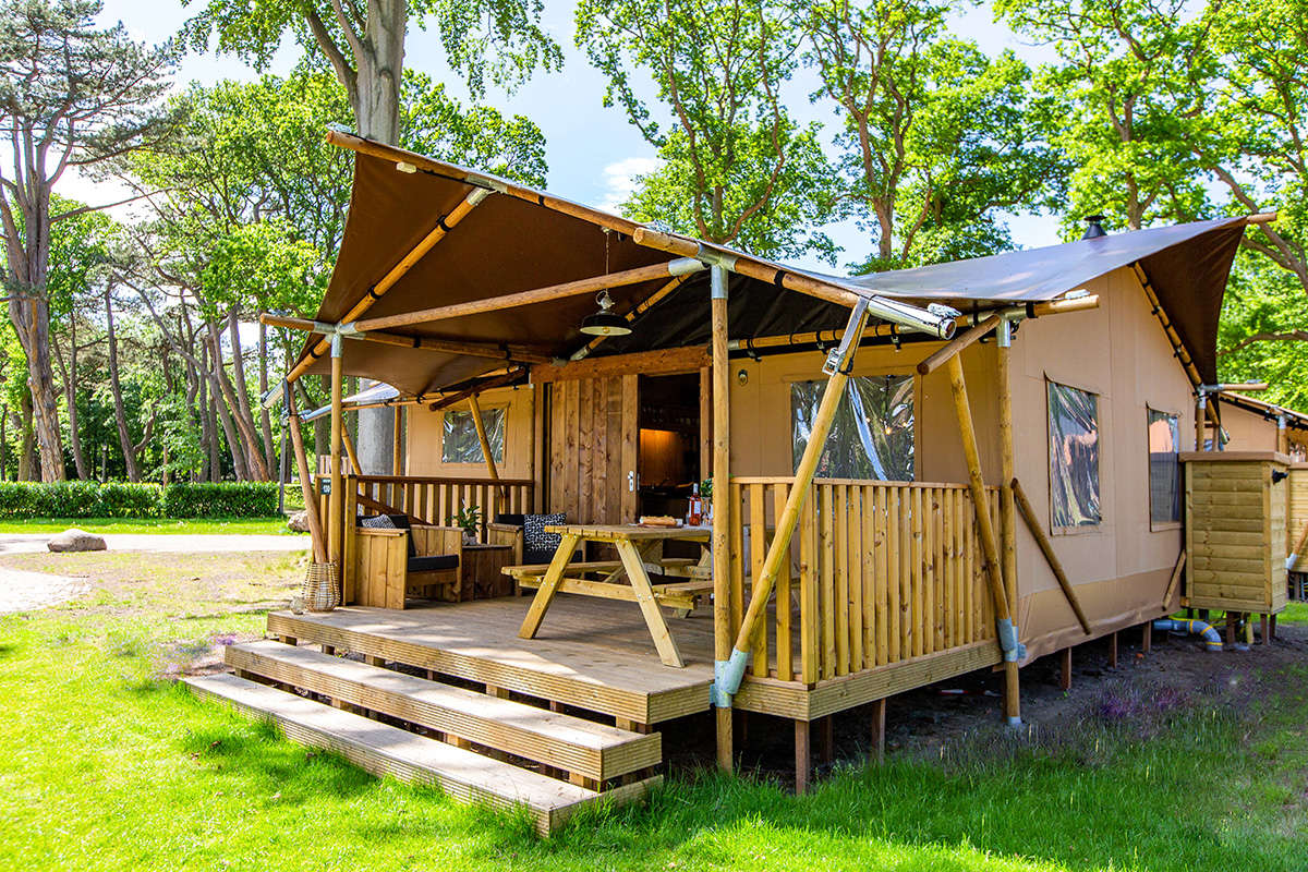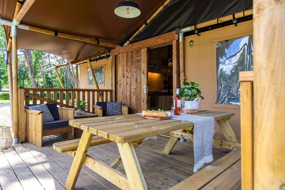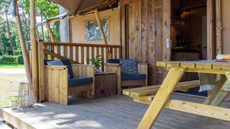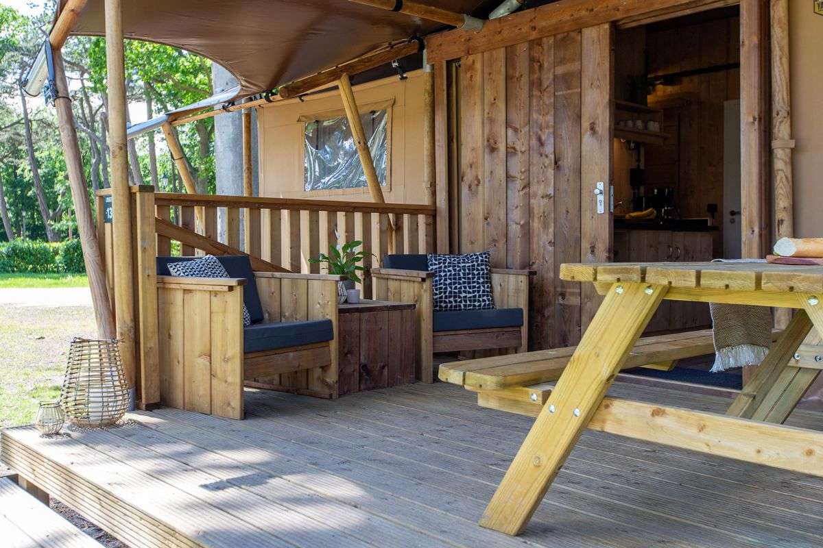 De Lodgetenten zijn van alle gemakken voorzien. Mede door de overkapte veranda en steigerhouten meubels kun je in deze Lodgetenten ultiem genieten van het buitenleven.