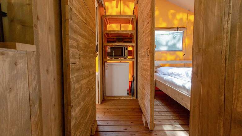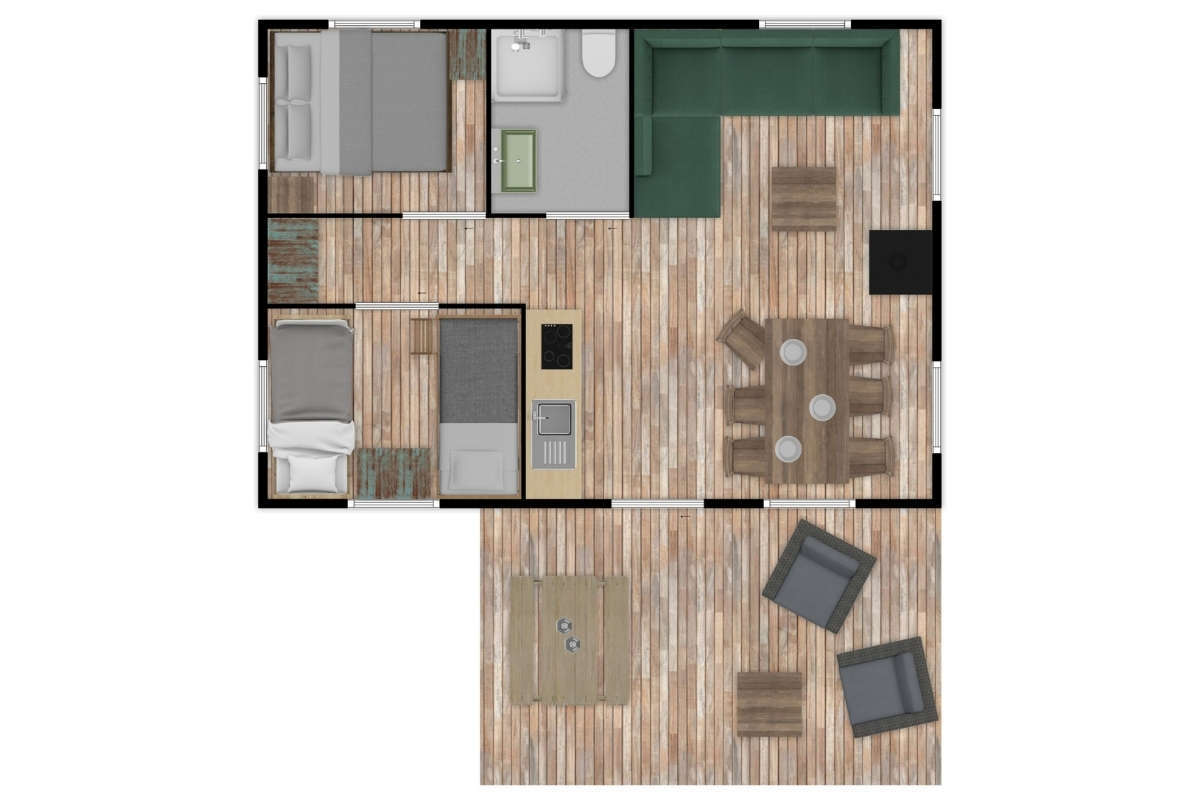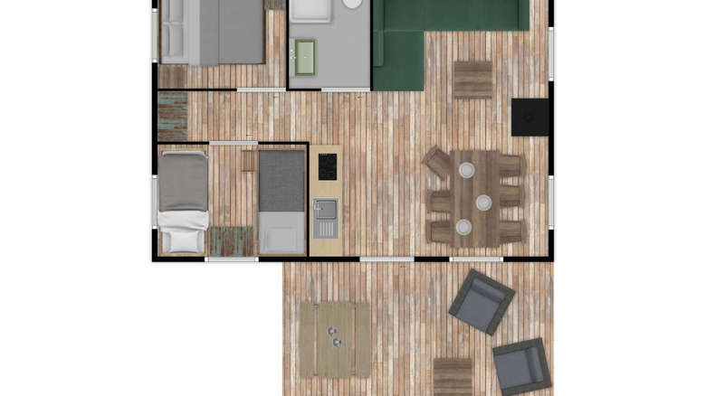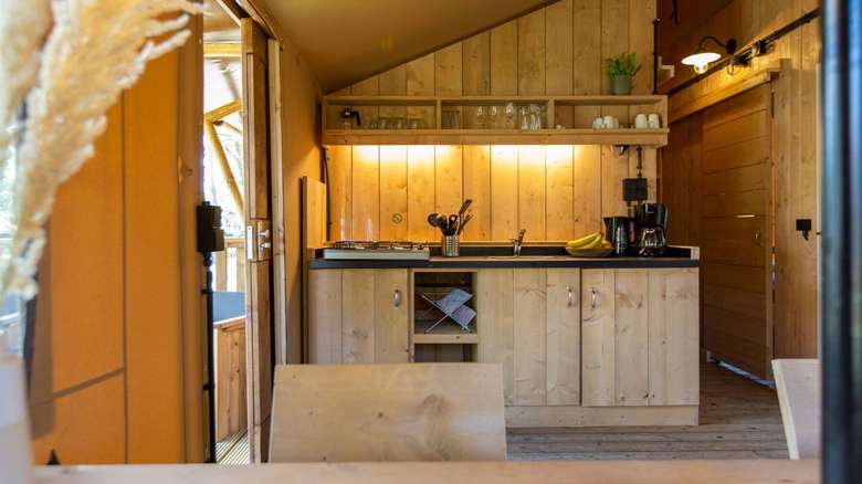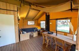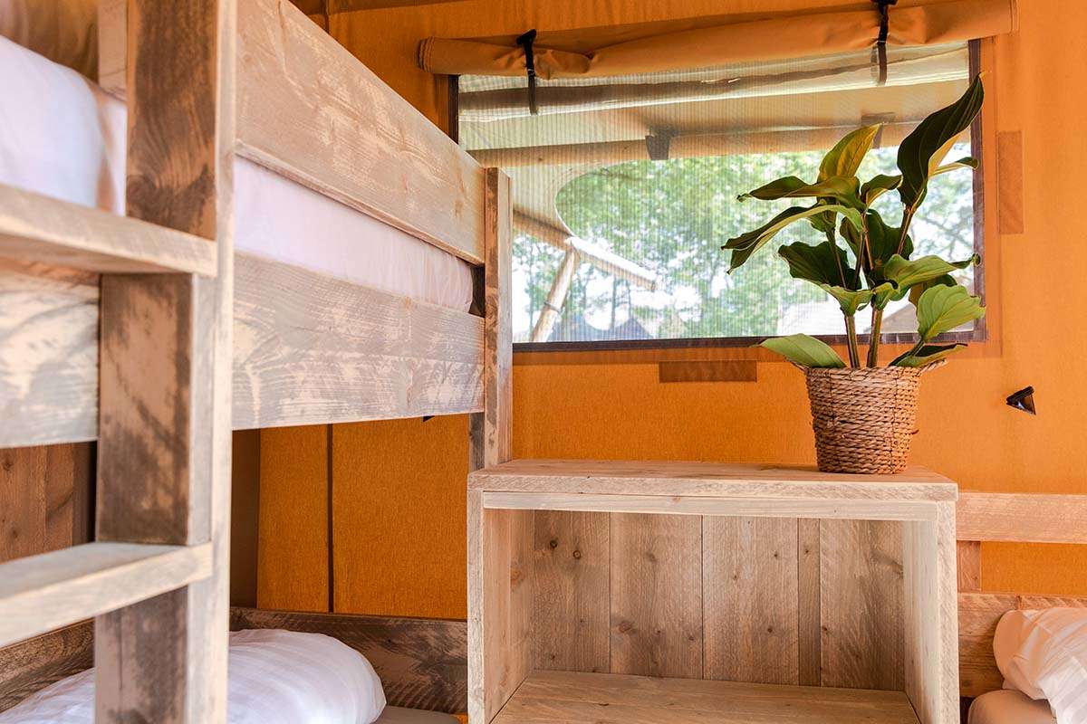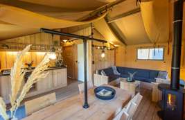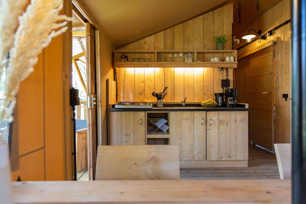 De Luxe Lodgetenten voor 5 personen hebben een volledig ingerichte keuken met onder andere een koelkast, vriesvak en koffiezetapparaat. Er is een zit- en eethoek waar je met z’n allen comfortabel kunt zitten. De Lodgetent is ook voorzien van een eigen badkamer met douche, wastafel en toilet.