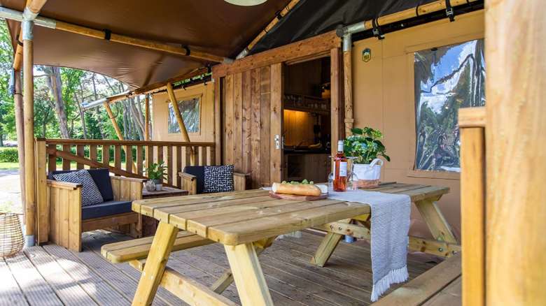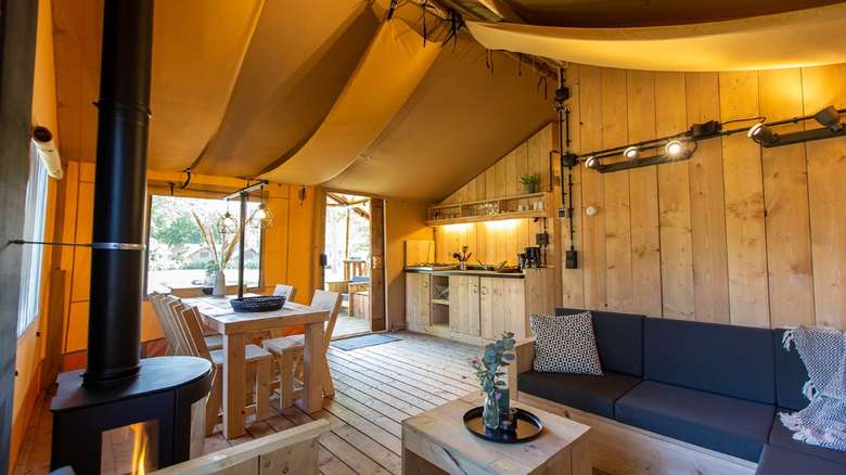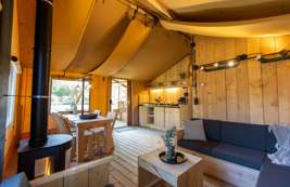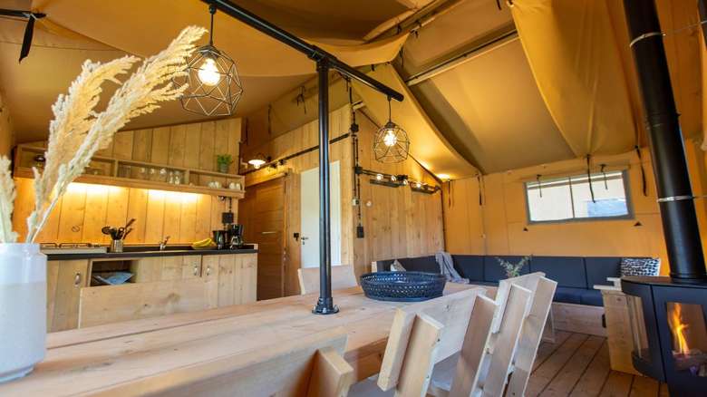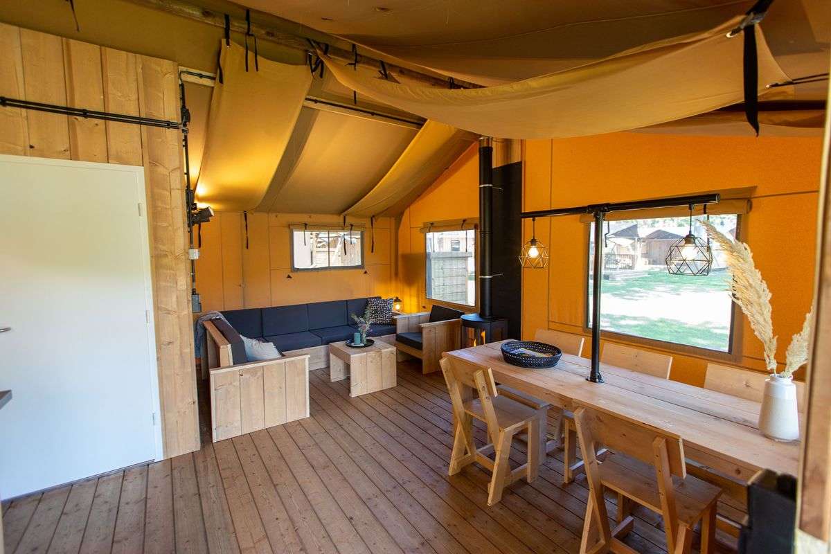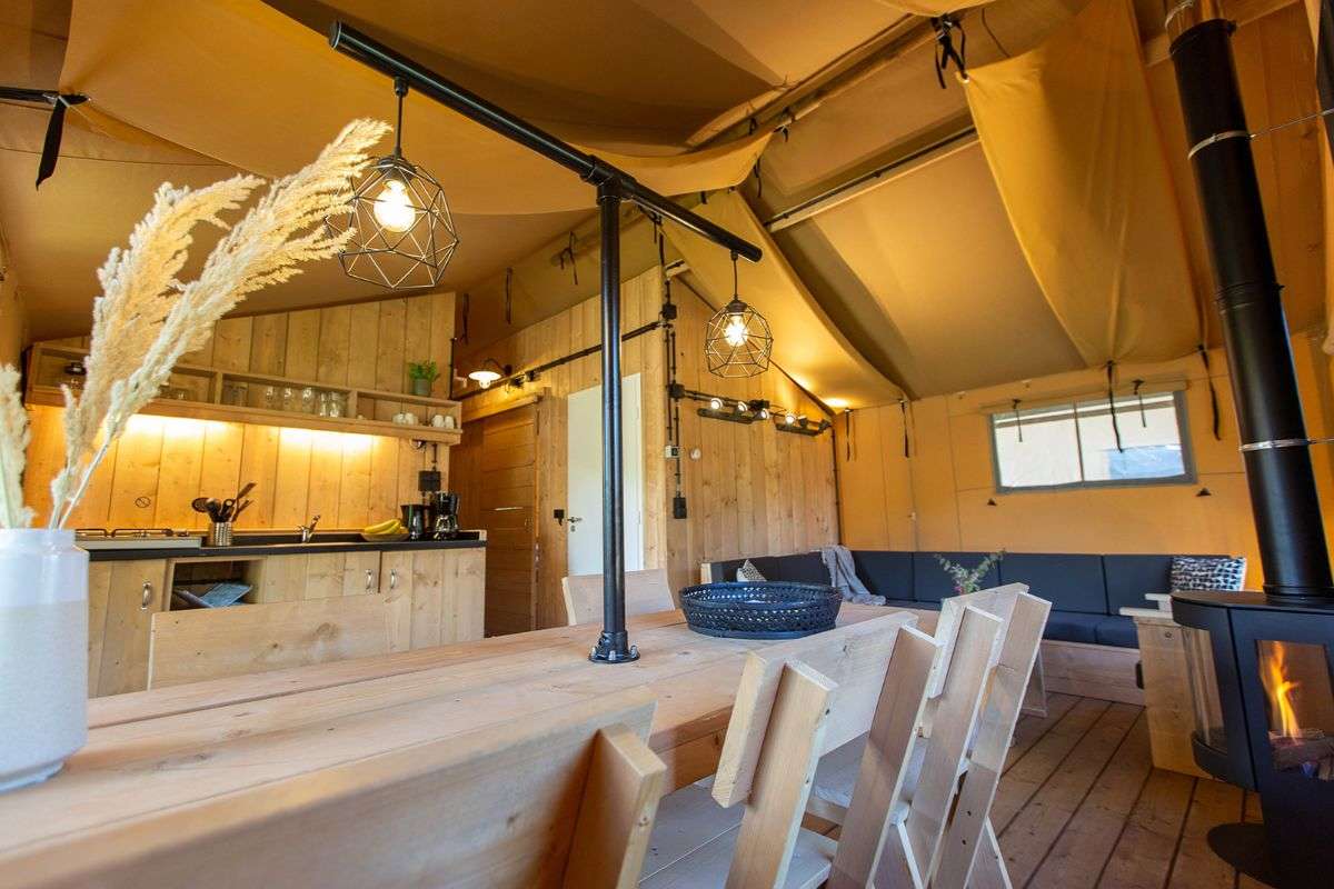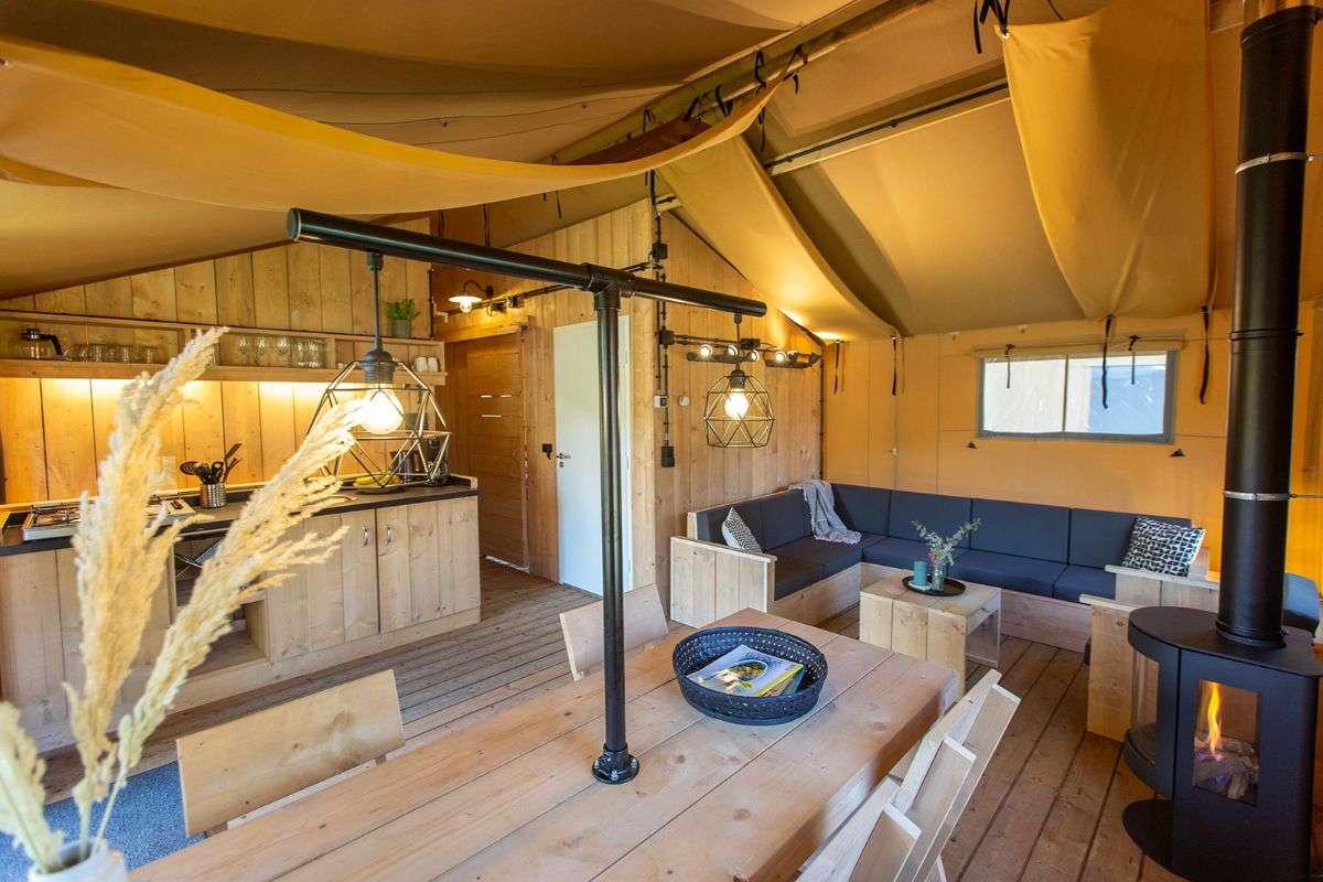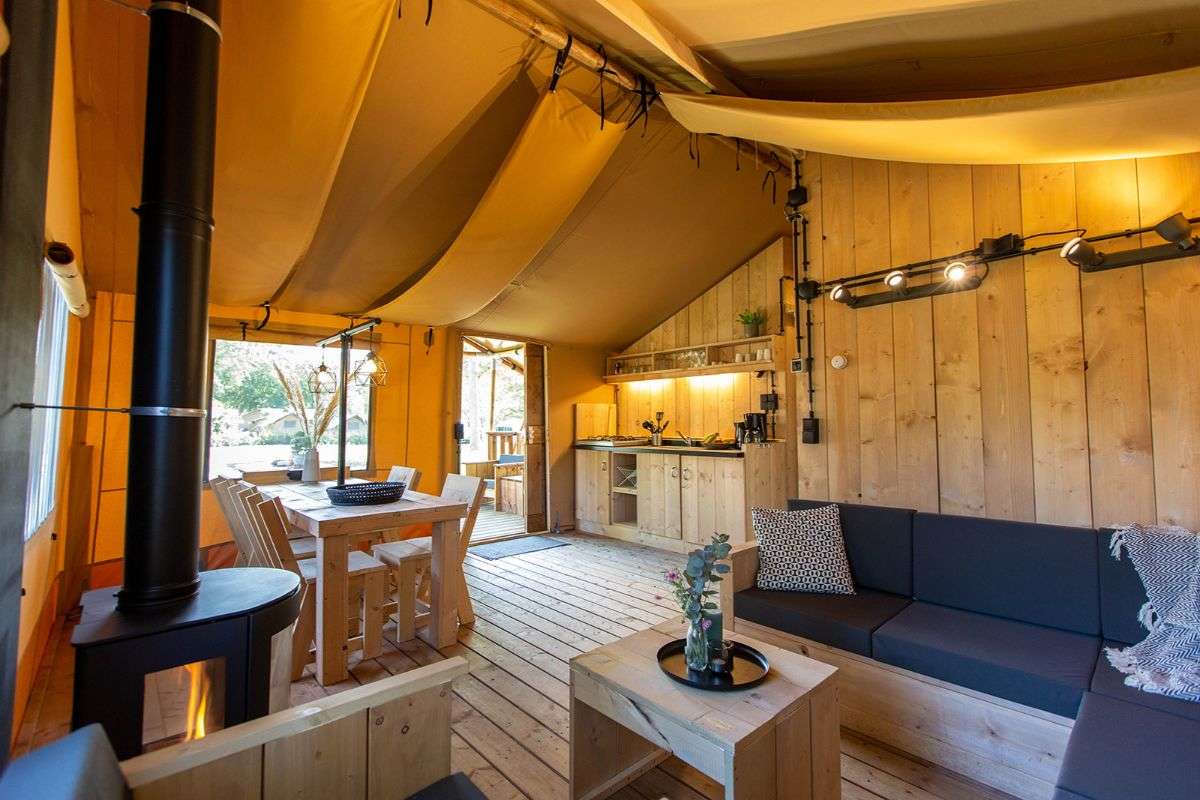 De Lodgetenten hebben een houten veranda met luifel. Op de loungestoelen of aan de picknickbank geniet je van het fijne buitenleven. Ook heeft deze Luxe Thermotent een gezellige sfeerhaard.
